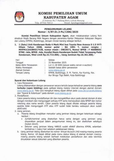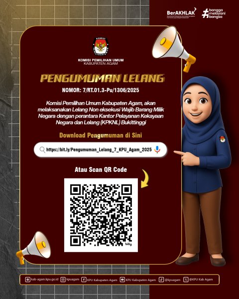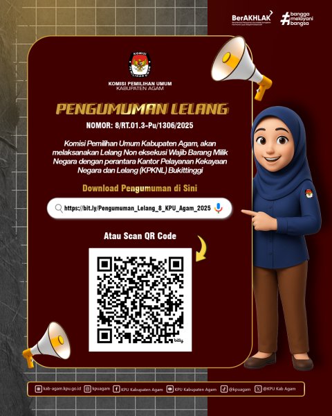 PENGUMUMAN LELANG Nomor: 5/RT.01.3-Pu/1306/2025 Komisi Pemilihan Umum Kabupaten Agam, akan melaksanakan Lelang Non eksekusi Wajib Barang Milik Negara dengan perantara Kantor Pelayanan Kekayaan Negara dan Lelang (KPKNL) Bukittinggi. Klik Disini ....