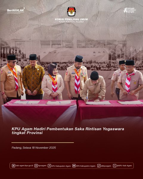 Komisi Pemilihan Umum (KPU) Kabupaten Agam menghadiri kegiatan Pembentukan Satuan Karya (Saka) Rintisan Yogaswara di lingkungan KPU Provinsi Sumatera Barat (Sumbar) dan KPU kabupaten dan kota Se Sumbar, di Balai Kota Padang. Pembentukan tersebut ditandai dengan penandatanganan Memorandum Of Understanding (MoU) antara KPU Sumbar dengan Kwartir Daerah 03 Gerakan Pramuka Sumbar. Kegiatan berlangsung lancar dihadiri pimpinan KPU Provinsi Sumbar, Ketua KPU kabupaten/kota, dan Ketua Divisi Sosialisasi Pendidikan Pemilih, Partisipasi Masyarakat dan SDM KPU, kabupaten/kota se Sumbar, serta undangan lainnya. Ketua KPU Kabupaten Agam Herman Susilo, didampingi Ketua Divisi Sosialisasi Pendidikan Pemilih (Sosdiklih), Partisipasi Masyarakat (Parmas) dan SDM KPU Agam Zainal Abadi, mengapresiasi pembentukan Saka Pramuka Rintisan Yogaswara di tingkat provinsi. Ini tentu akan menjadi salah satu motor dalam pendidikan pemilih. “ Alhamdulillah kami berkesempatan hadir pada pembentukan Saka Rintisan Yogaswara sekaligus penandatanganan MoU antara KPU Sumbar dan Kwartir Daerah 03 Gerakan Pramuka Sumbar pada, Selasa (18/11) kemarin. KPU Agam sangat mendukung dan akan menindaklanjutinya di tingkat kabupaten,” kata Herman Susilo, Kamis (20/11). Ia menambahkan, pembentukan saka pramuka merupakan salah satu upaya KPU dalam memberikan pendidikan pemilih bagi generasi muda. Dikatakannya generasi muda merupakan penerus bangsa dan harus diberikan pemahaman demokrasi khususnya penggunaan hak suara dengan benar. “KPU Kabupaten Agam sangat berkomitmen dalam mendorong pendidikan politik dalam rangka peningkatan partisipasi masyarakat. Dengan konsisten memberikan pemahaman politik, tentunya partisipasi masyarakat dalam menggunakan hak suara akan meningkat,” jelasnya. ....
