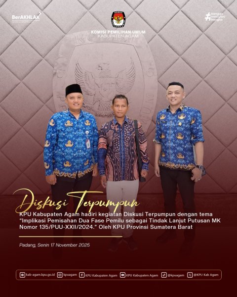 Komisi Pemilihan Umum (KPU) Kabupaten Agam mengikuti Forum Diskusi Terpumpun (FDT) Sistem Pemilu di Indonesia yang diselenggarakan KPU Provinsi Sumatera Barat (Sumbar) di aula utama kantor setempat. Kegiatan ini diikuti oleh KPU kabupaten dan kota se Sumbar. FDT tersebut mengusung tema implikasi pemisahan dua fase pemilu sebagai tindak lanjut Putusan Mahkamah Konstitusi (MK) nomor 135/PUU-XXII/2024 terhadap manajemen dan desain sistem pemilu. Kegiatan tersebut menghadirkan narasumber langsung Ketua Divisi Teknis Penyelenggaraan Pemilu KPU Republik Indonesia, Idham Holik. Ketua Divisi Teknis Penyelenggaraan Pemilu KPU Kabupaten Agam, Zainal Fatli, di Lubuk Basung, Rabu (19/11) mengatakan, paparan yang disampaikan oleh Anggota KPU RI bapak Idham Holik sangat perlu diketahui oleh KPU kabupaten dan kota. Sehingga KPU di kabupaten dan kota juga mampu menjelaskan ke publik bagaimana implikasi dari putusan MK tersebut. “ Kami turut mengikuti kegiatan FDT di KPU Sumbar pada Senin (17/11) kemarin. Bapak Idham menjelaskan dengan sangat detail bagaimana Implikasi dua fase pemilu. KPU Kabupaten Agam tentunya sangat mendukung pelaksanaan pemilu lebih baik pada masa yang akan datang,” tutup Zainal Fatli. Dalam kesempatan Itu Ketua Divisi Teknis Penyelenggaraan Pemilu Zainal Fatli turut didampingi oleh Kasubbag Teknis dan Hukum Welzi Martson, dan Staf Sekretariat KPU Kabupaten Agam Febri Yogi. Kegiatan berlangsung dengan dinamis di mana peserta sangat antusias mengikuti pemaparan narasumber. ....