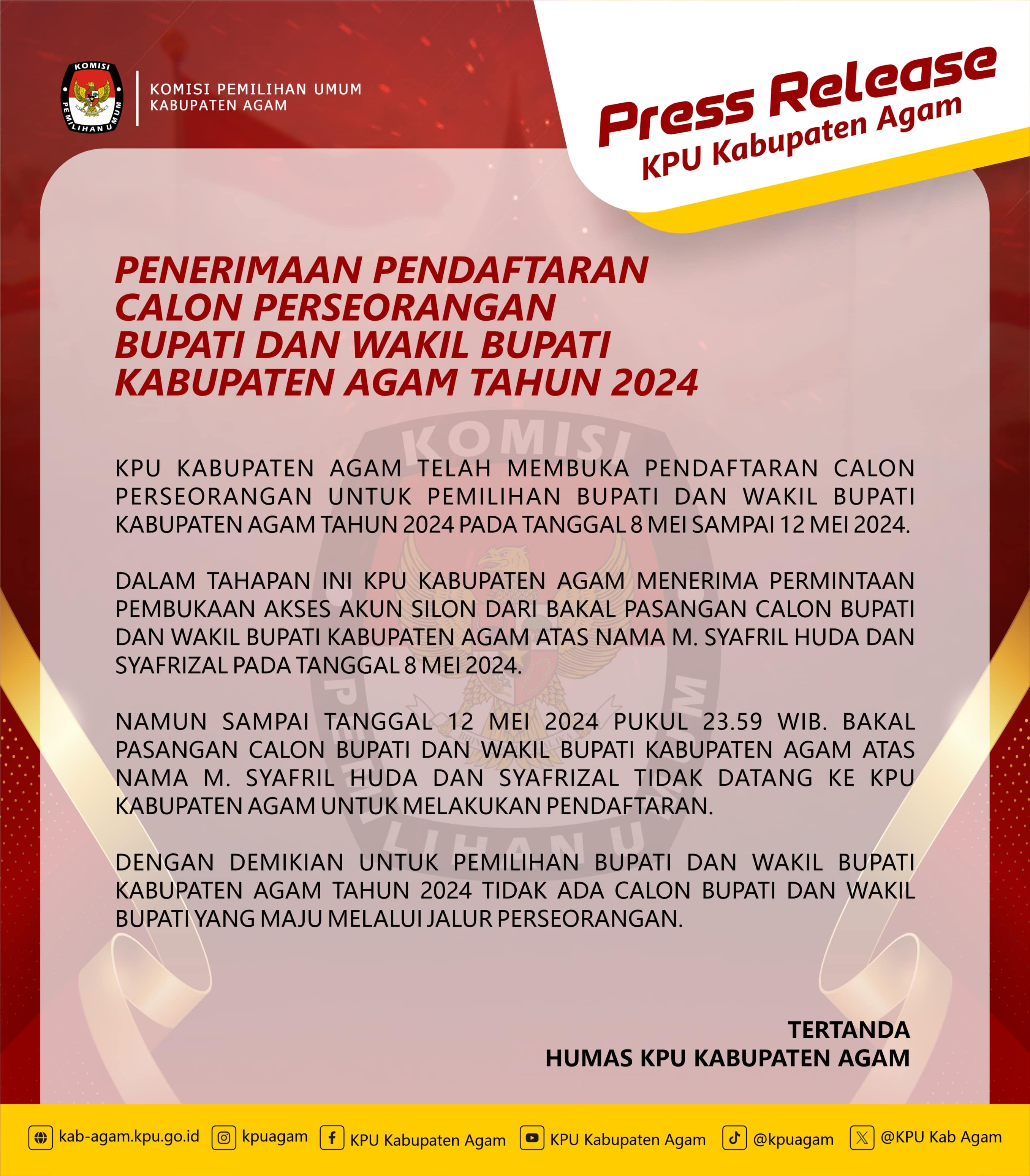 KPU KABUPATEN AGAM TELAH MEMBUKA PENDAFTARAN CALON PERSEORANGAN UNTUK PEMILIHAN BUPATI DAN WAKIL BUPATI KABUPATEN AGAM TAHUN 2024 PADA TANGGAL 8 MEI SAMPAI 12 MEI 2024.