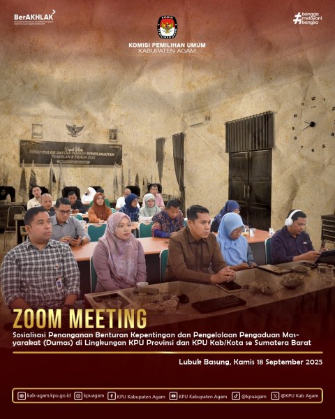 Komisi Pemilihan Umum (KPU) Kabupaten Agam mengikuti sosialisasi penanganan benturan kepentingan dan pengelolaan pengaduan masyarakat (Dumas) yang diselenggarakan oleh KPU Provinsi Sumatera Barat (Sumbar) secara daring, Kamis (18/09). Kegiatan tersebut juga diikuti oleh KPU kabupaten dan kota se-Sumbar.