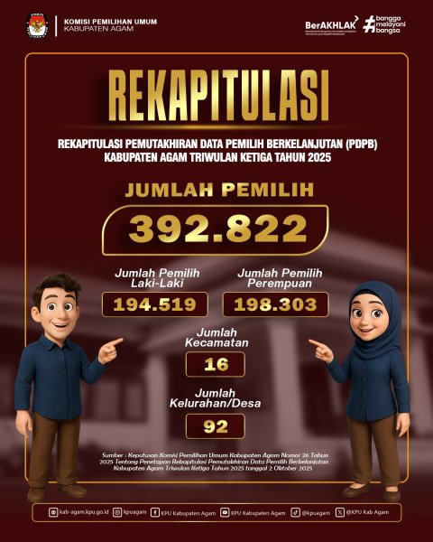 Berikut Disampaikan Rekapitulasi Pemutakhiran Data Pemilih Berkelanjutan (PDPB) Kabupaten Agam Triwulan Tiga Tahun 2025