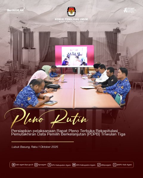 Dalam kesempatan itu jajaran pimpinan KPU Kabupaten Agam juga melakukan evaluasi terhadap pleno sebelumnya. Salah satu fokus rapat tersebut adalah mempersiapkan pelaksanaan Rapat Pleno Terbuka Rekapitulasi Pemutakhiran Data Pemilih Berkelanjutan (PDPB) Triwulan Tiga yang akan dilaksanakan pada 2 Oktober 2025.