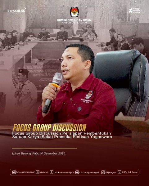 Komisi Pemilihan Umum (KPU) Kabupaten Agam menggelar Focus Group Discussion (FGD) dalam rangka Pembentukan Satuan Karya (Saka) Pramuka Rintisan Yogaswara di Aula Husni Kamil Manik, Kantor KPU Kabupaten Agam, Rabu (10/12). FGD dilakukan untuk menyamakan persepsi dan memberikan pengetahuan kepramukaan.