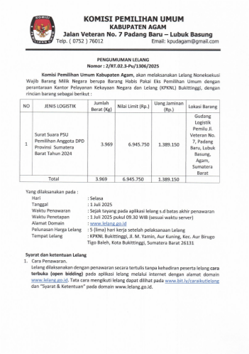 Komisi Pemilihan Umum Kabupaten Agam, akan melaksanakan Lelang Noneksekusi Wajib Barang Milik Negara berupa Barang Habis Pakai Eks Pemilihan Umum dengan perantaraan Kantor Pelayanan Kekayaan Negara dan Lelang (KPKNL) Bukittinggi, dengan rincian barang sebagai berikut: Klik Disini