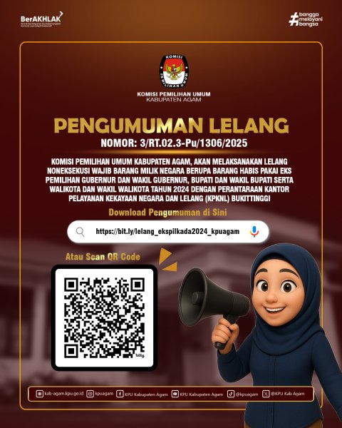 Komisi Pemilihan Umum Kabupaten Agam, akan melaksanakan Lelang Noneksekusi Wajib Barang Milik Negara berupa Barang Habis Pakai Eks Pemilihan Gubernur dan Wakil Gubernur, Bupati dan Wakil Bupati, serta Walikota dan Wakil Walikota Tahun 2024 dengan perantaraan Kantor Pelayanan Kekayaan Negara dan Lelang (KPKNL) Bukittinggi, dengan rincian barang sebagai berikut : KLIK DISINI