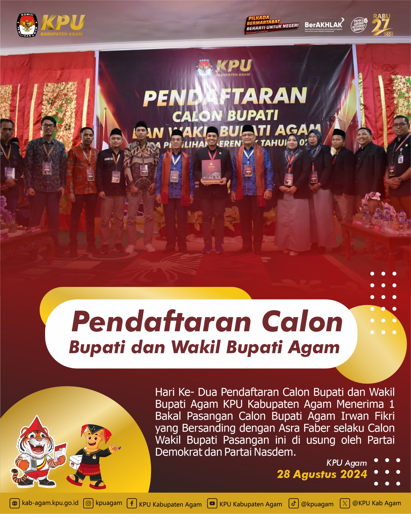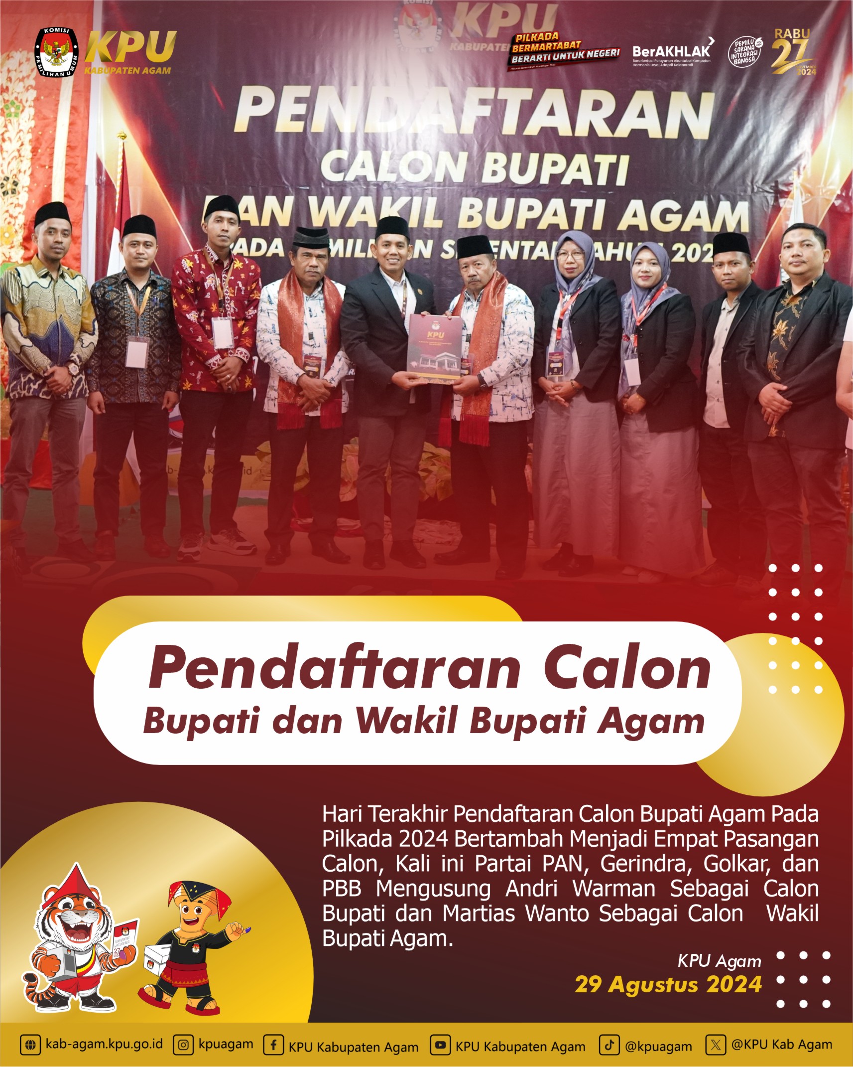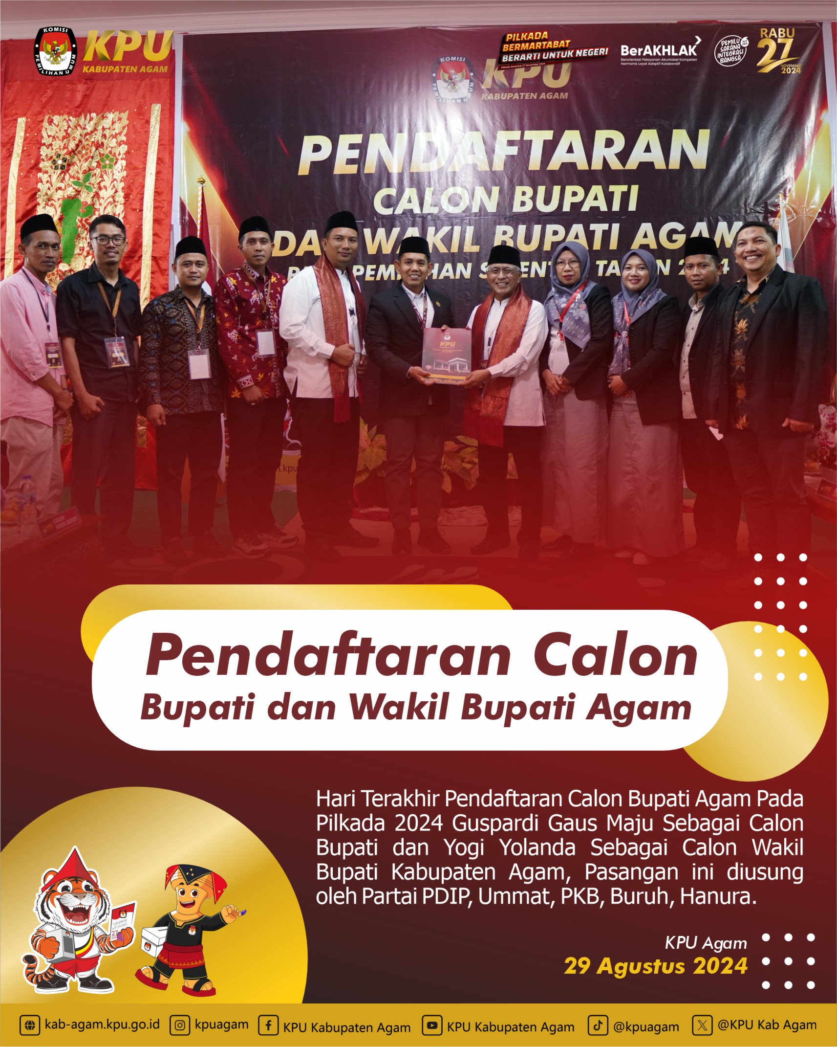 Hari Ke- Tiga / 29 Agustus 2024 Pendaftaran Calon Bupati dan Wakil Bupati Agam KPU Kabupaten Agam Kembali Menerima 1 Bakal Pasangan Calon Bupati Agam Guspardi Gaus Maju Sebagai Calon Bupati dan Yogi Yolanda Sebagai Calon Wakil Bupati Kabupaten Agam, Pasangan ini diusung oleh Partai PDIP, Ummat, PKB, Buruh, Hanura.