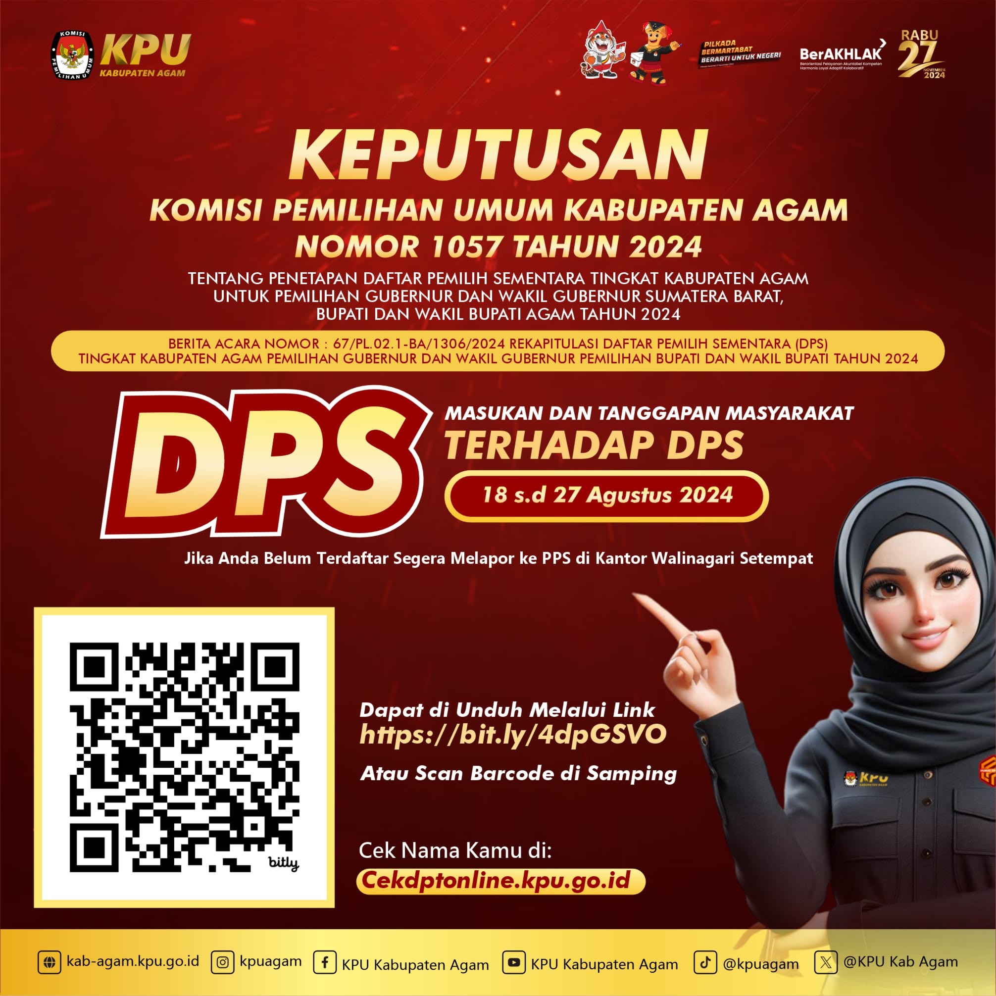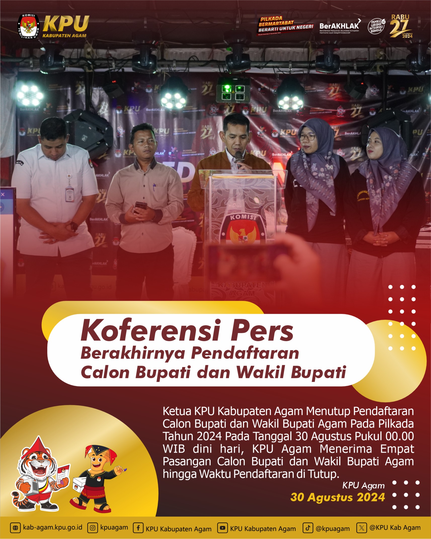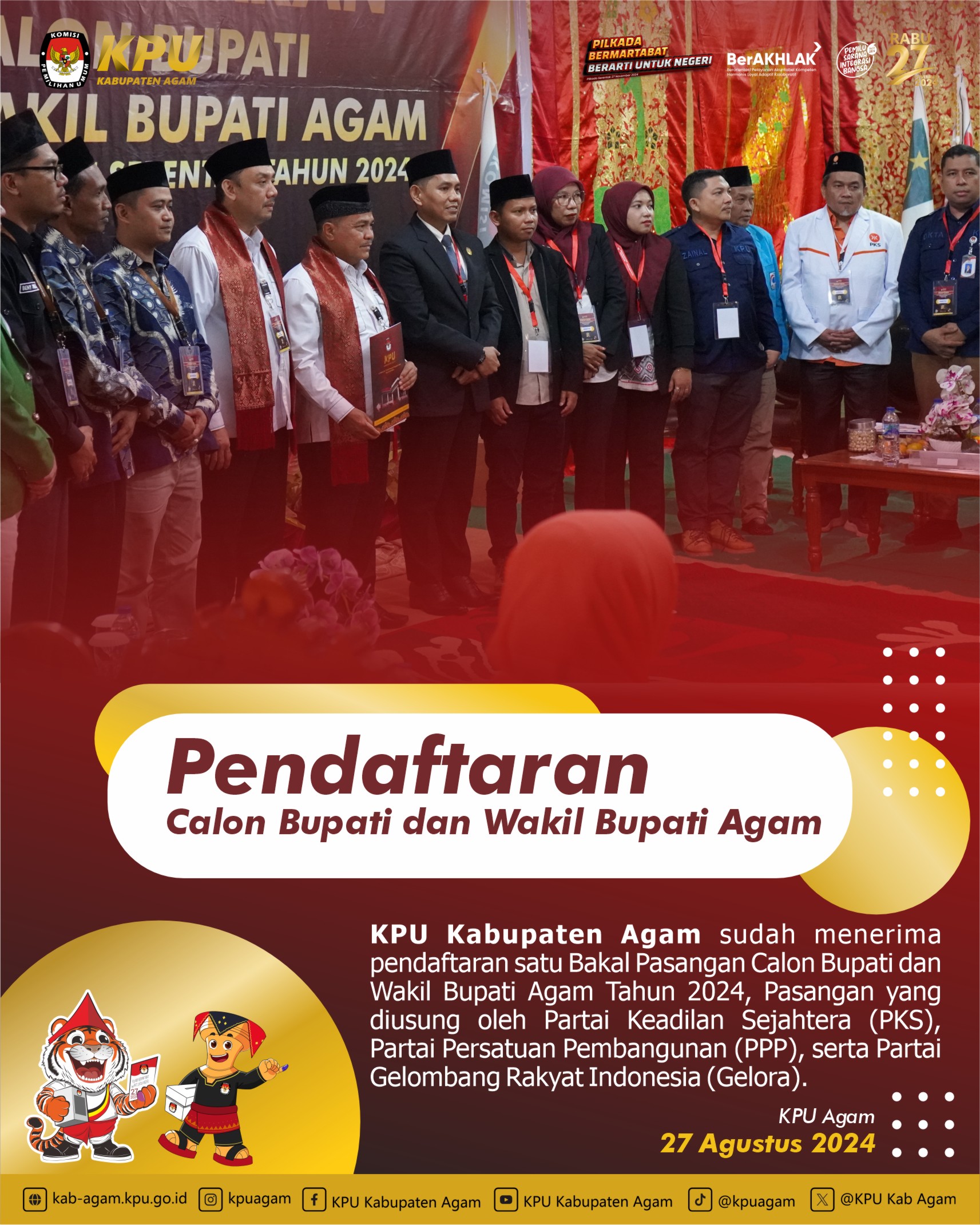 Hari Ke- Tiga / 29 Agustus 2024 Pendaftaran Calon Bupati dan Wakil Bupati Agam KPU Kabupaten Agam Kembali Menerima 1 Bakal Pasangan Calon Bupati Agam Guspardi Gaus Maju Sebagai Calon Bupati dan Yogi Yolanda Sebagai Calon Wakil Bupati Kabupaten Agam, Pasangan ini diusung oleh Partai PDIP, Ummat, PKB, Buruh, Hanura.