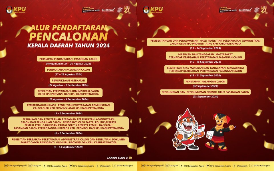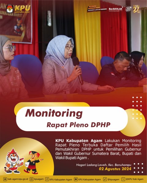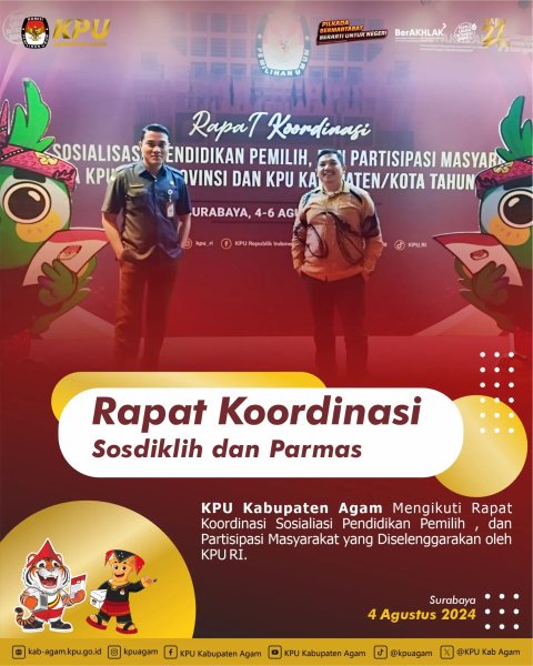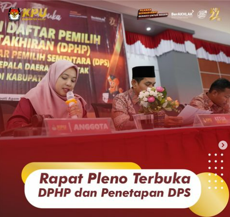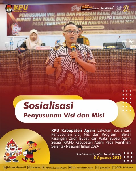 Lubuk Basung – Komisi Pemilihan Umum (KPU) Kabupaten Agam menggelar kegiatan Sosialisasi Penyusunan Visi, Misi, dan Program Bakal Pasangan Calon Bupati dan Wakil Bupati Agam dalam rangka Pemilihan Serentak Nasional Tahun 2024. Kegiatan ini dilaksanakan pada Senin, 5 Agustus 2024, bertempat di Hotel Sakura Syari’ah Lubuk Basung.