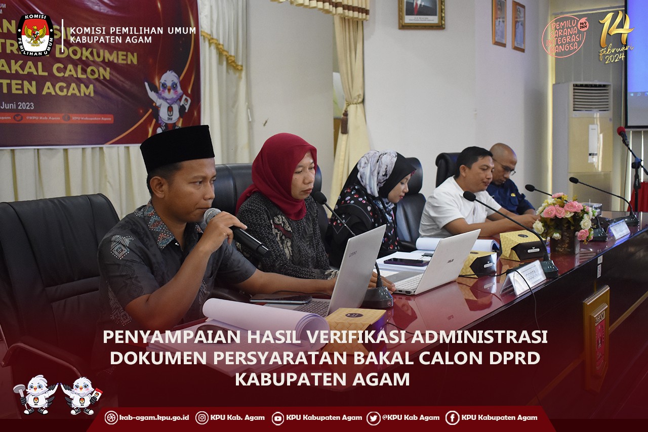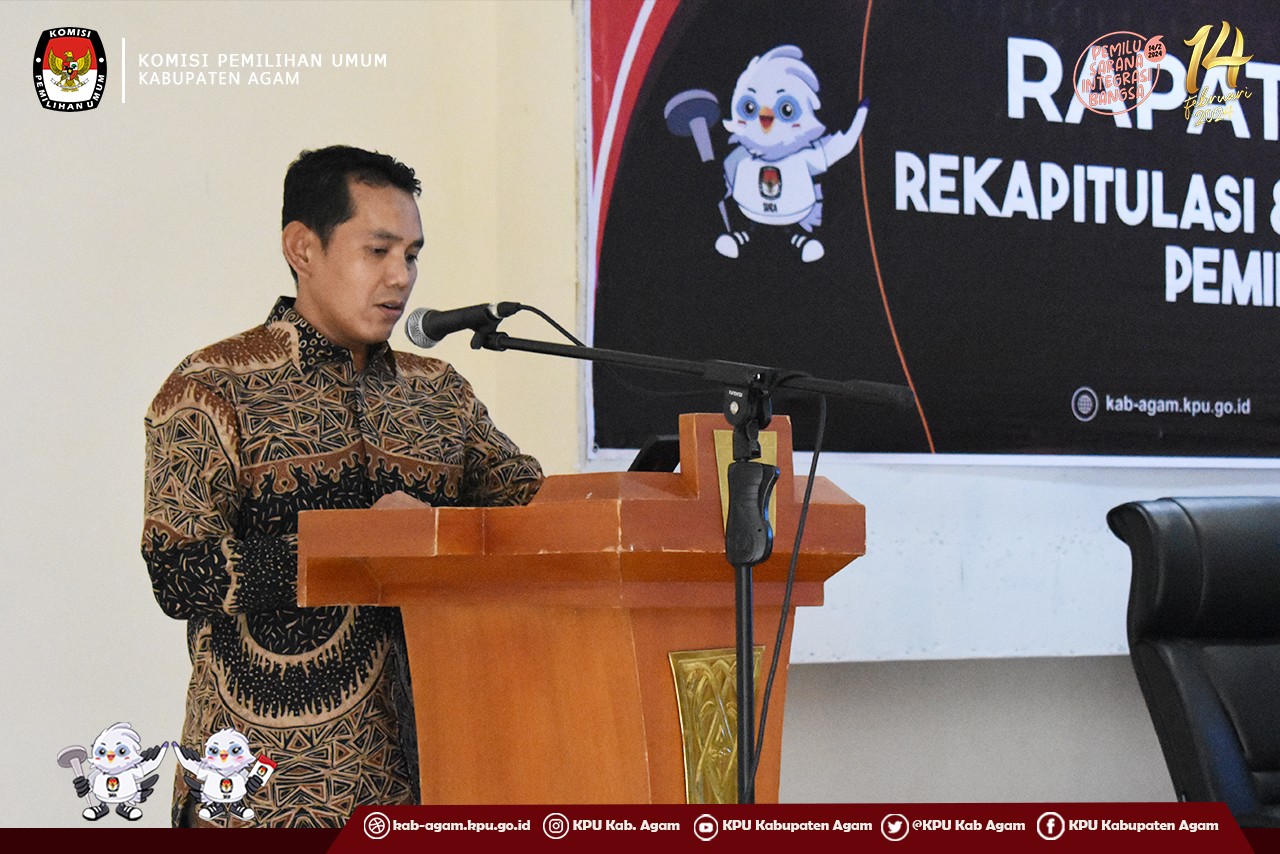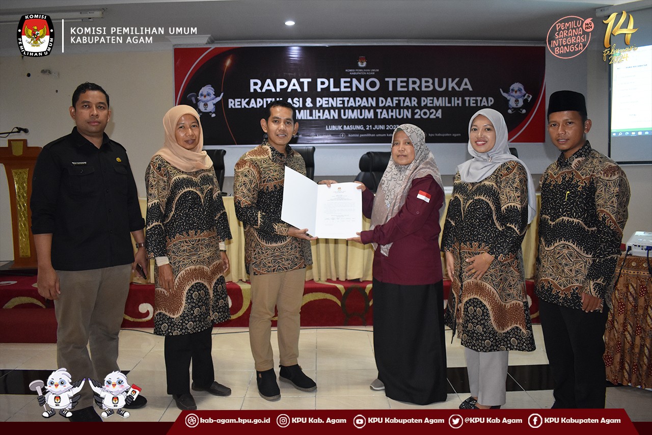 LUBUKBASUNG, KPU- Komisi Pemilihan Umum (KPU) Kabupaten Agam menggelar rapat pleno terbuka rekapitulasi dan penetapan Daftar Pemilih Tetap (DPT) pemilihan Umum (Pemilu ) tahun 2024, di Aula Badan Perencanaan Pembangunan Daerah (Bappeda) Kabupaten Agam, Rabu (21/6) sore.