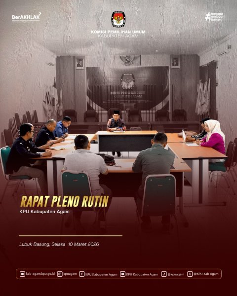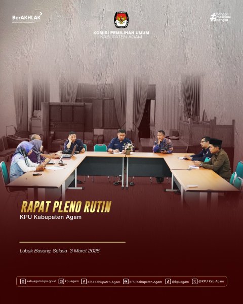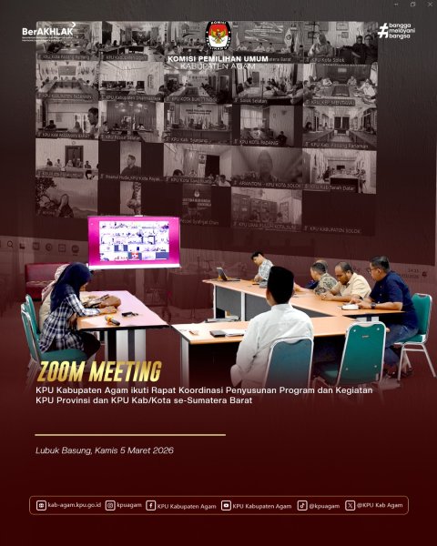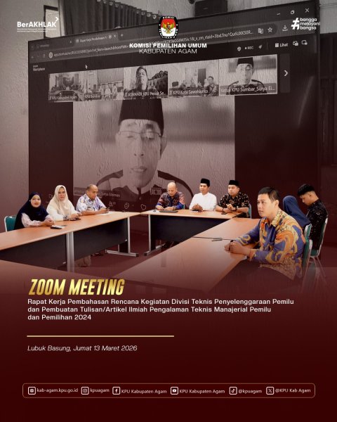 Komisi Pemilihan Umum (KPU) Kabupaten Agam mengikuti Rapat Kerja pembahasan rencana kegiatan Divisi Teknis Penyelenggaraan Pemilu serta penyusunan artikel ilmiah terkait pengalaman teknis dan manajerial Pemilu dan Pemilihan Tahun 2024. Kegiatan ini dilaksanakan secara daring oleh Komisi Pemilihan Umum Provinsi Sumatera Barat dan diikuti oleh seluruh KPU kabupaten/kota se-Sumatera Barat pada Jumat (13/03). Rapat kerja tersebut dibuka secara langsung oleh Ketua Komisi Pemilihan Umum Provinsi Sumatera Barat, Surya Efitrimen. Dalam arahannya, ia menekankan pentingnya perencanaan kegiatan yang matang serta dokumentasi pengalaman teknis dan manajerial sebagai bahan pembelajaran dan penguatan kelembagaan ke depan. Dari Kabupaten Agam, kegiatan ini diikuti oleh jajaran pimpinan Komisi Pemilihan Umum Kabupaten Agam yang mengikuti rapat dari Aula Husni Kamil Manik (HKM), Kantor KPU Kabupaten Agam. Hadir dalam kegiatan tersebut Ketua KPU Kabupaten Agam Herman Susilo, Ketua Divisi Perencanaan Data dan Informasi Lizawati Fitri, Sekretaris KPU Kabupaten Agam Oktadonis, serta jajaran kasubbag dan staf sekretariat. Rapat ini membahas rencana kegiatan Divisi Teknis Penyelenggaraan Pemilu ke depan, sekaligus mendorong penyusunan artikel ilmiah yang memuat pengalaman teknis dan manajerial selama penyelenggaraan Pemilu dan Pemilihan Tahun 2024. Hal ini diharapkan dapat menjadi referensi serta kontribusi pemikiran dalam peningkatan kualitas penyelenggaraan pemilu yang profesional dan berintegritas. Melalui keikutsertaan dalam kegiatan ini, KPU Kabupaten Agam menunjukkan komitmennya dalam meningkatkan kapasitas kelembagaan, serta mendukung pengembangan pengetahuan berbasis pengalaman dalam penyelenggaraan pemilu dan pemilihan.