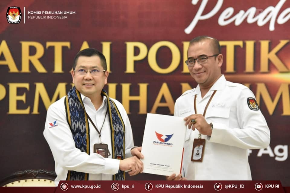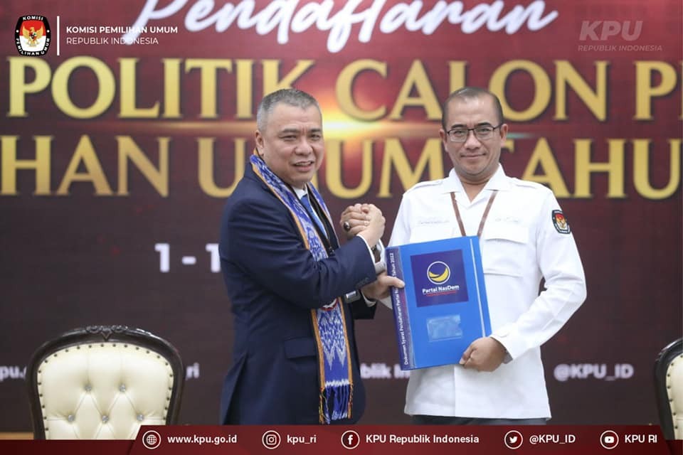 Hari pertama dibukanya proses pendaftaran partai politik calon peserta Pemilu 2024, sebanyak sembilan partai politik (terdri dari pimpinan dan pengurus tingkat nasional) menyerahkan berkas pendaftarannya ke Kantor Komisi Pemilihan Umum (KPU), Senin, (1/8/2022).