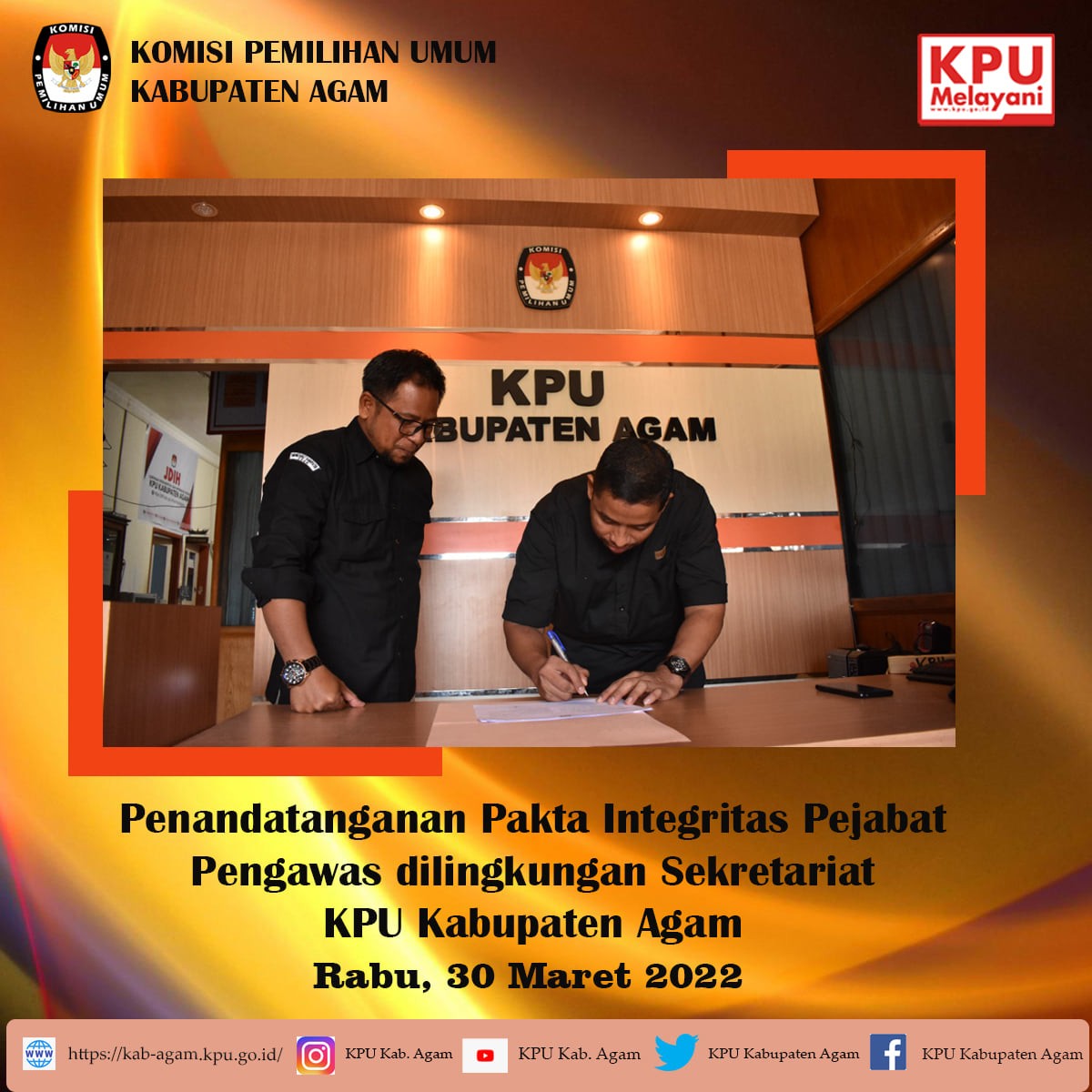 Terdapat 4 Pejabat Pengawas melakukan Penandatanganan yang disaksikan langsung oleh Sekretaris KPU Kabupaten Agam (Oktadonis, S.Pd,M.I.P) antara lain, Kasubbag Keuangan Umum Dan Logistik (Fery Aprinal, SH, M.Si), Kasubbag Teknis Dan Hupmas (Zenli Iswandi, S.IP), Kasubbag Program Dan Data (Defrizal, S.Kom), Kasubbag Hukum Dan SDM (Welzi Martason, SH).