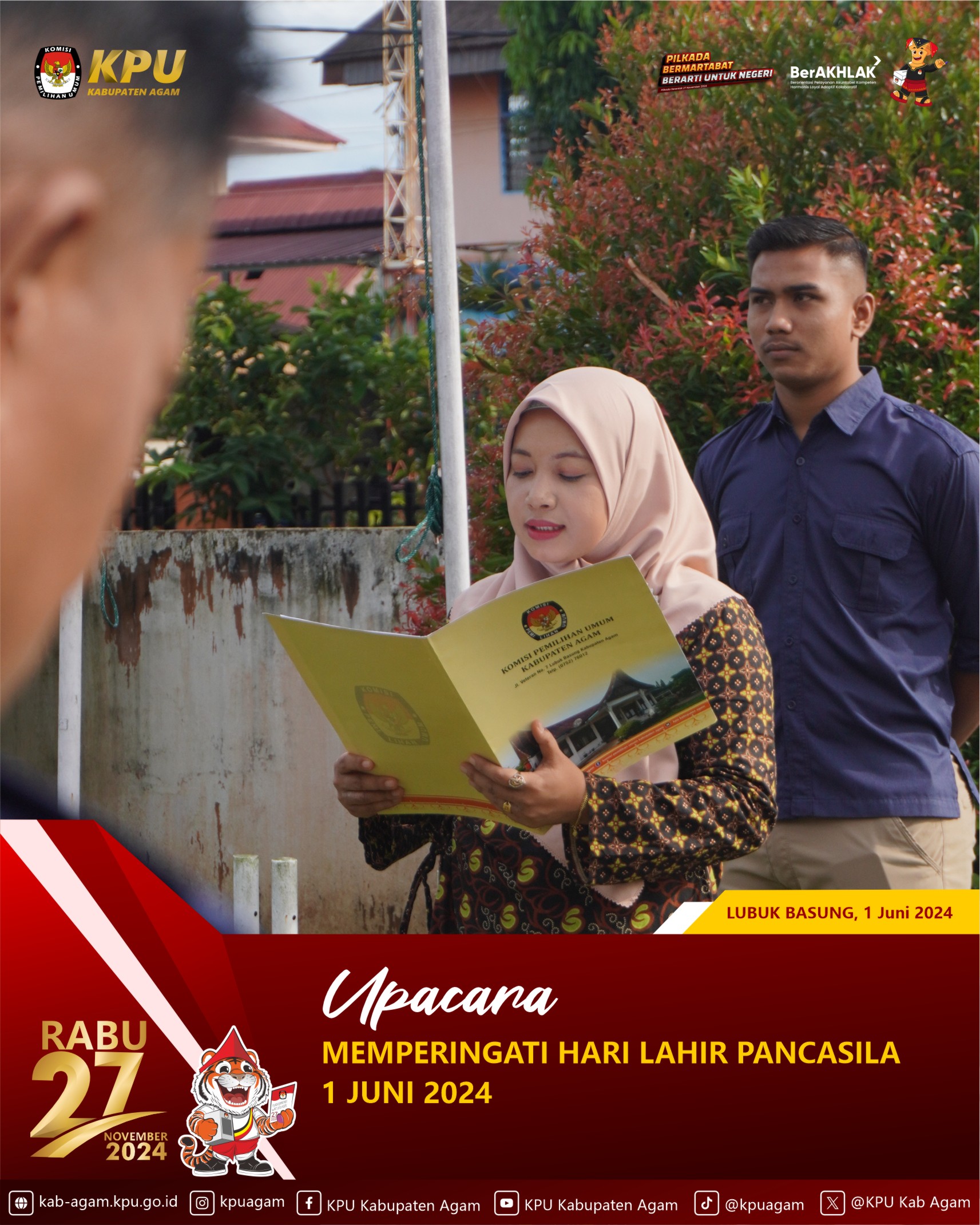 KPU Kabupaten Agam Laksanakan Upacara Dalam Rangka Memperingati Hari Lahirnya Pancasila di halaman Kantor KPU Kabupaten Agam Pada Hari Sabtu, 1 Juni 2024.