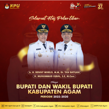 Lubuk Basung – Komisi Pemilihan Umum (KPU) Kabupaten Agam menyampaikan ucapan selamat dan sukses atas pelantikan Bupati dan Wakil Bupati Agam terpilih, Bapak Benni Warlis dan Bapak Muhammad Iqbal, untuk masa jabatan periode 2025–2030. Prosesi pelantikan secara resmi dilaksanakan pada Kamis, 20 Februari 2025 di Jakarta, bersama dengan kepala daerah terpilih lainnya dari berbagai kabupaten/kota di Indonesia, sebagai bagian dari agenda nasional pemerintahan. KPU Kabupaten Agam turut merasa bangga dan mengapresiasi seluruh tahapan Pemilihan Bupati dan Wakil Bupati Agam Tahun 2024 yang telah berlangsung secara langsung, umum, bebas, rahasia, jujur, dan adil, hingga menghasilkan pemimpin daerah pilihan rakyat. "Kami mengucapkan selamat atas dilantiknya Bapak Benni Warlis dan Bapak Muhammad Iqbal sebagai Bupati dan Wakil Bupati Agam periode 2025–2030. Semoga amanah ini dapat dijalankan dengan baik demi kemajuan dan kesejahteraan masyarakat Kabupaten Agam," ujar Ketua KPU Kabupaten Agam, Herman Susilo. KPU Kabupaten Agam juga mengucapkan terima kasih kepada seluruh masyarakat, penyelenggara pemilu, serta stakeholder yang telah mendukung suksesnya pelaksanaan Pemilihan Serentak Tahun 2024. Semoga kepemimpinan baru ini menjadi awal dari pengabdian terbaik untuk membangun Agam yang lebih maju, mandiri, dan bermartabat dalam lima tahun ke depan.