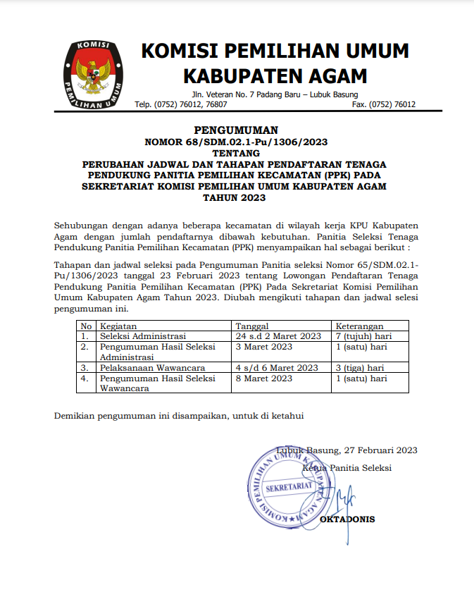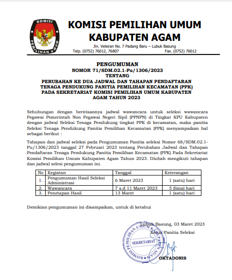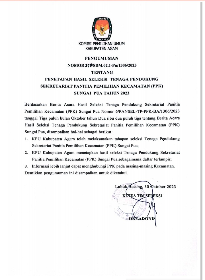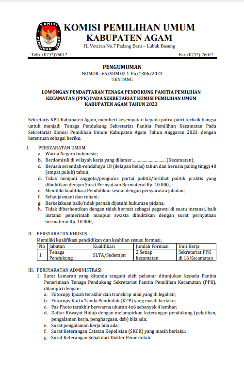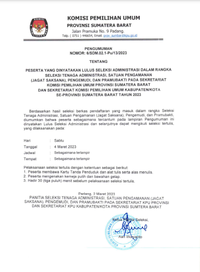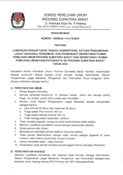 PENGUMUMAN NOMOR: 1 /SDM.02.1-Pu/13/2023 TENTANG LOWONGAN PENDAFTARAN TENAGA ADMINISTRASI, SATUAN PENGAMANAN (JAGAT SAKSANA), PENGEMUDI, DAN PRAMUBAKTI SEKRETARIAT KOMISI PEMILIHAN UMUM PROVINSI SUMATERA BARAT DAN SEKRETARIAT KOMISI PEMILIHAN UMUM KABUPATEN/KOTA SE-PROVINSI SUMATERA BARAT TAHUN 2023.