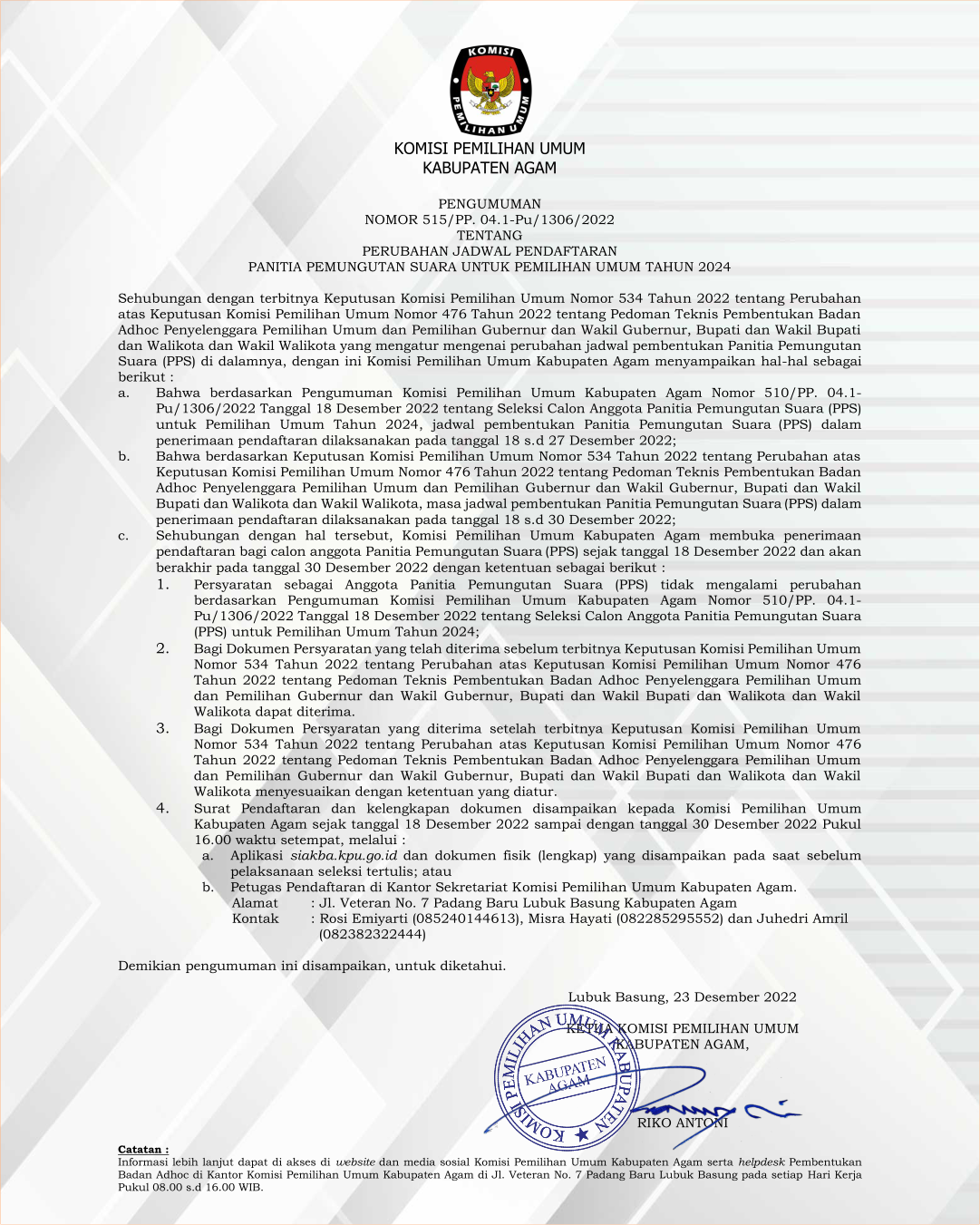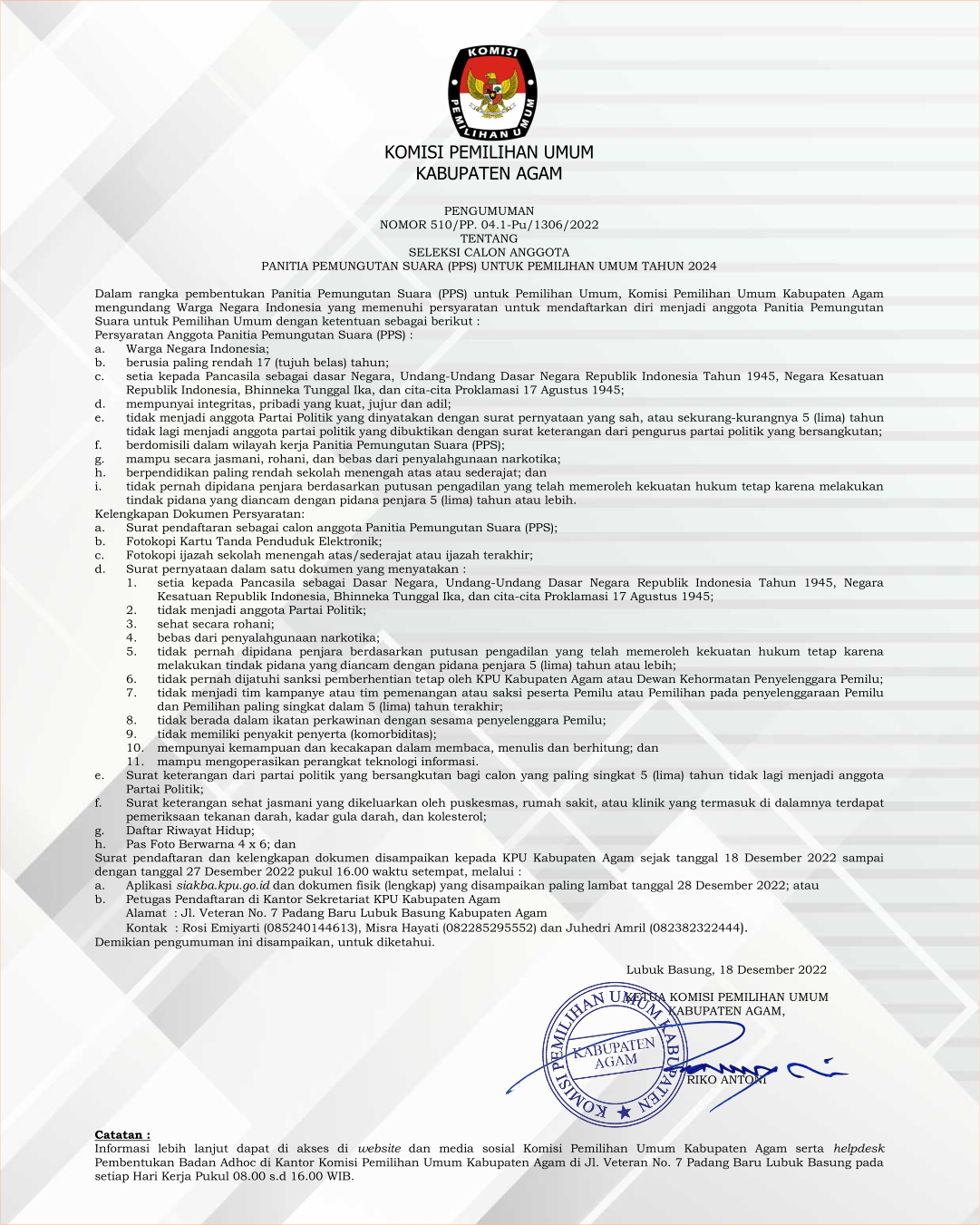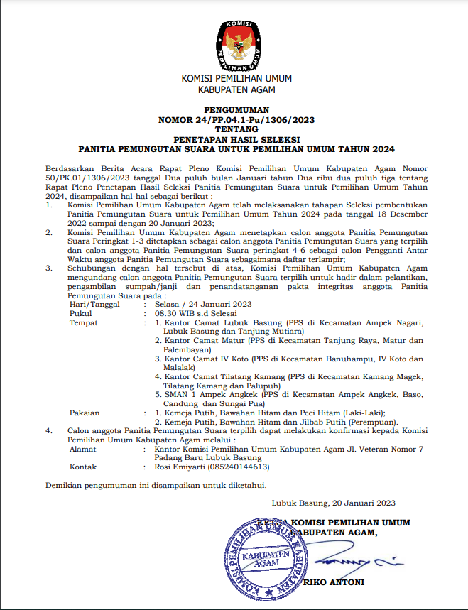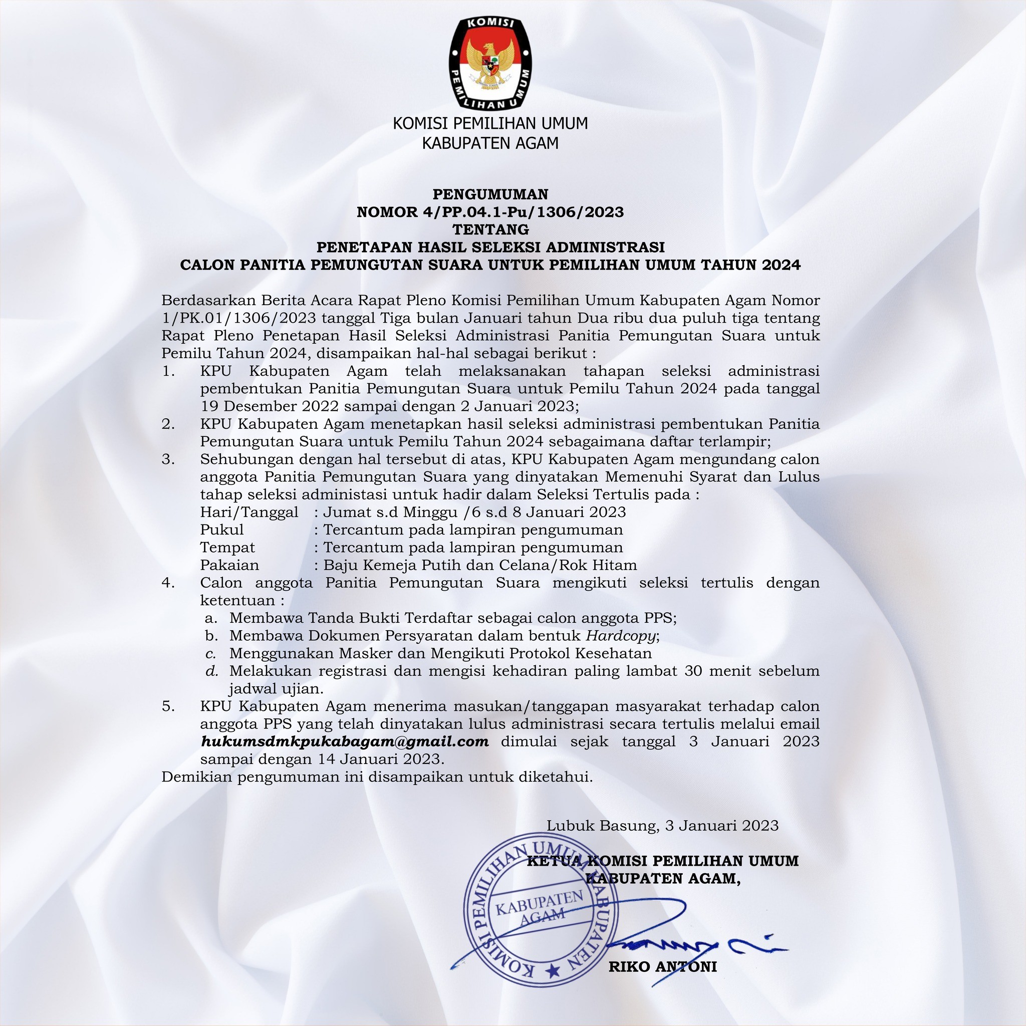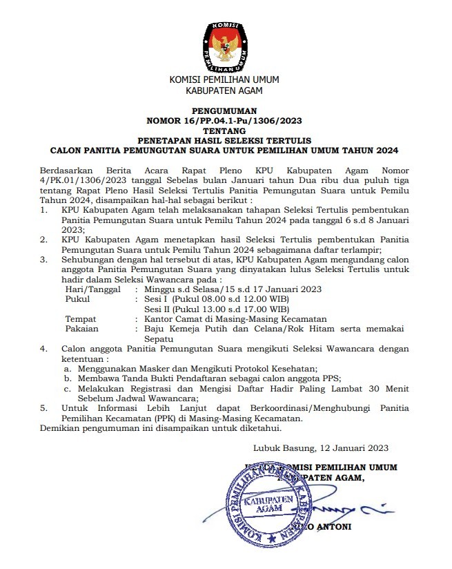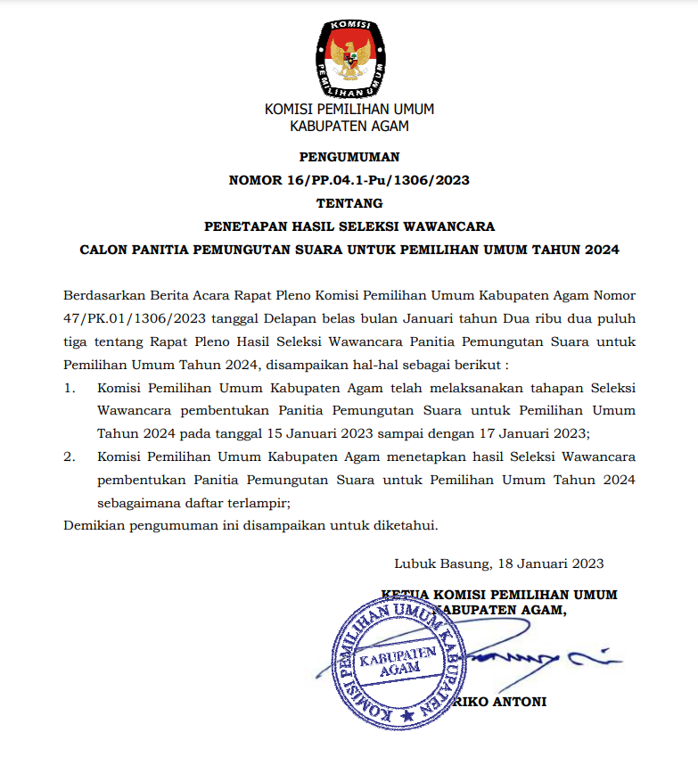 Berdasarkan Berita Acara Rapat Pleno Komisi Pemilihan Umum Kabupaten Agam Nomor 47/PK.01/1306/2023 tanggal Delapan belas bulan Januari tahun Dua ribu dua puluh tiga tentang Rapat Pleno Hasil Seleksi Wawancara Panitia Pemungutan Suara untuk Pemilihan Umum Tahun 2024, disampaikan hal-hal sebagai berikut : Berdasarkan Berita Acara Rapat Pleno Komisi Pemilihan Umum Kabupaten Agam Nomor 47/PK.01/1306/2023 tanggal Delapan belas bulan Januari tahun Dua ribu dua puluh tiga tentang Rapat Pleno Hasil Seleksi Wawancara Panitia Pemungutan Suara untuk Pemilihan Umum Tahun 2024, disampaikan hal-hal sebagai berikut : 1. Komisi Pemilihan Umum Kabupaten Agam telah melaksanakan tahapan Seleksi Wawancara pembentukan Panitia Pemungutan Suara untuk Pemilihan Umum Tahun 2024 pada tanggal 15 Januari 2023 sampai dengan 17 Januari 2023; 2. Komisi Pemilihan Umum Kabupaten Agam menetapkan hasil Seleksi Wawancara pembentukan Panitia Pemungutan Suara untuk Pemilihan Umum Tahun 2024 sebagaimana daftar terlampir.Download Disini
