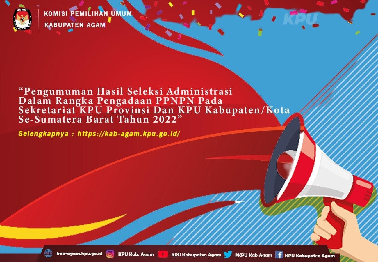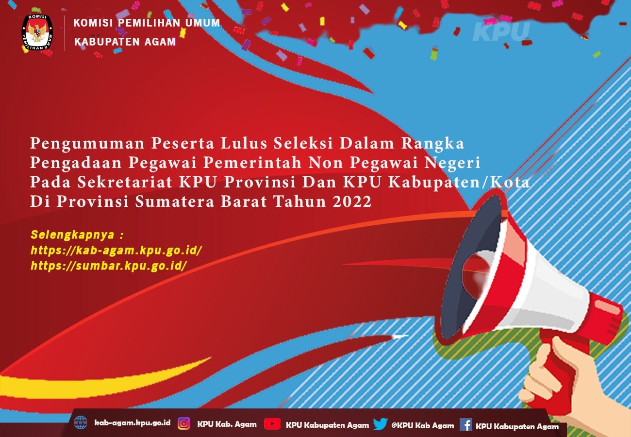 Berdasarkan hasil seleksi wawancara Pengadaan Pegawai Pemerintah Non Pegawai Negeri (PPNP) dilingkungan Seketariat KPU Provinsi dan Sekretariat KPU Kabupaten/Kota di Provinsi Sumatera Barat Tahun 2022y yang dilaksanakan tanggal 24 s/d 25 Mei 2022, diumumkan bahwa peserta sebagaimana tercantum pada lampiran Pengumuman ini dinyatakan Lulus Seleksi Pegawai Pemerintah Non Pegawai Negeri dan selanjutnya melakukan pendaftran ulang kepada panitia Seleksi di KPU Provinsi dan KPU Kabupaten/Kota paling lambat 2 Juni 2022 pukul 16.00 Wib dengan membawa seluruh dokumen asli sebagaimana pengumuman Panitia Seleksi nomor 1/SDM.02.1-Pu/13/2022 tanggal 11 Mei 2022 tentang Pendaftaran Pegawai Pemerintah Non Pegawai Negeri (PPNPN) Sekretariat KPU Provinsi Sumatera Barat dan Sekretariat KPU Kabupaten/Kota se Provinsi Sumatera Barat Tahun Anggaran 2022. Bagi peserta yang dinyatakan lulus dan tidak melakukan pendaftaran ulang sesuai jadwal yang telah ditentukan, dinyatakan tidak memenuhi syarat. Download Disini