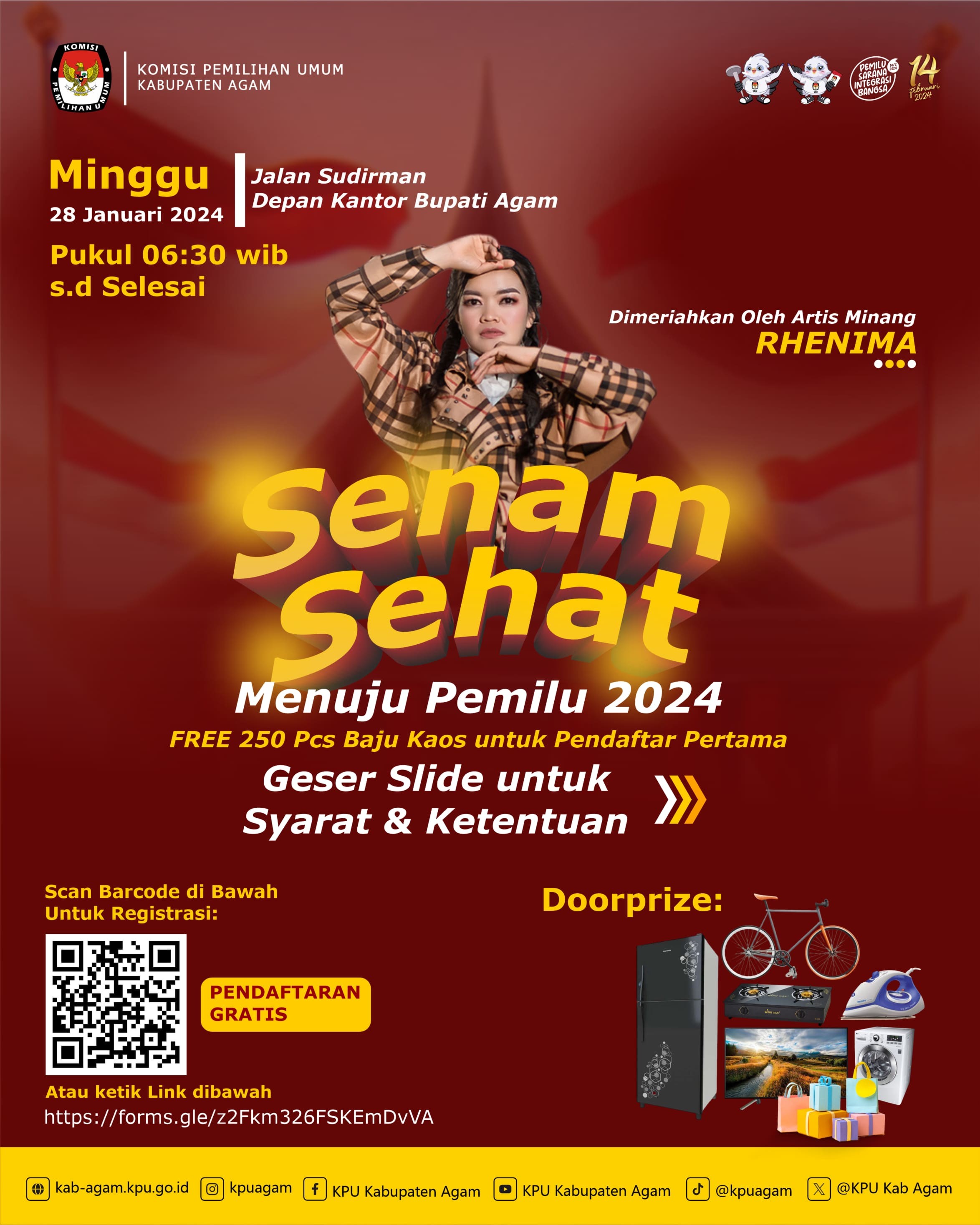 Kegiatan Senam Sehat juga akan di isi oleh artis minang Rhenima, Rhenima akan menghibur masyarakat Agam serta berbagi doorprize mearik lainnya.